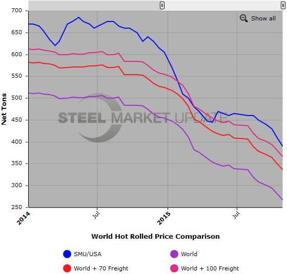 The latest Steel Market Update hot rolled price average is $390 per ton for domestic steel, down $20 per ton compared to the last time we did an update on world prices and down $40 per ton over late-September. The theoretical spread between the world HR export price and the SMU HR price is $23 to $53 per ton ($123 prior to import costs), down $6 from our previous analysis and down $13 from late-September.