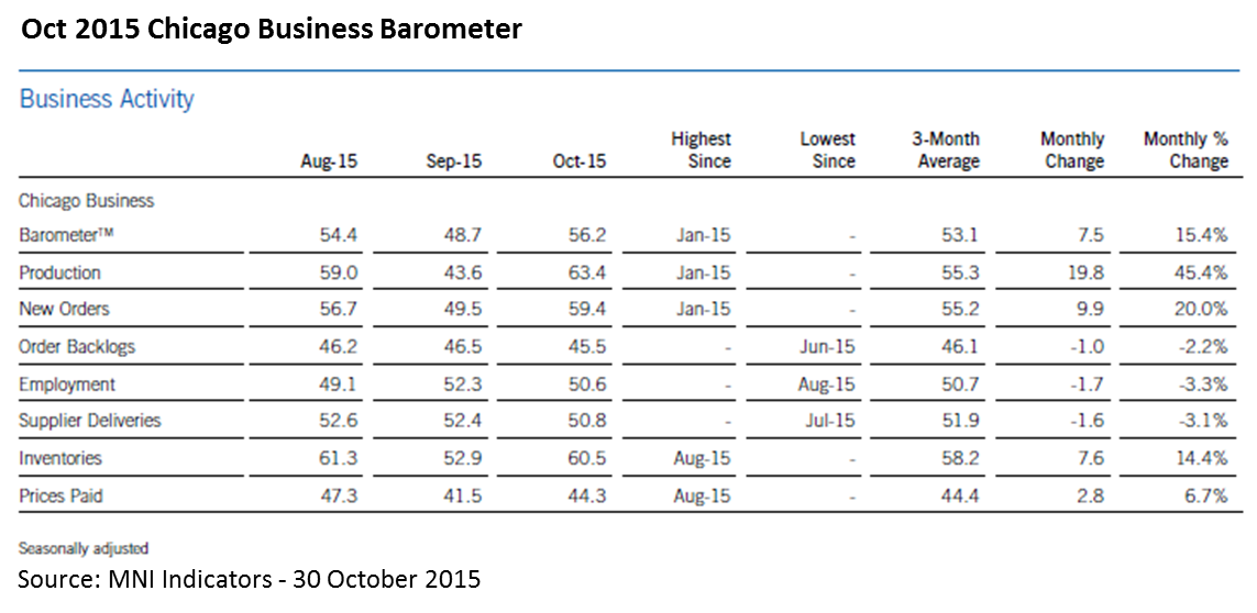 The Chicago Business Barometer gained 7.5 points to register 56.2 in October. The bounceback was due mainly from strong gains in production and new orders. All three indicators were at their highest reading since January of this year. On a three month moving average the Barometer was 53.1, up 15.4 percent from September.