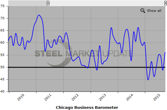Below is a graph showing the history of the Chicago Business Barometer. You will need to view the graph on our website to use it’s interactive features, you can do so by clicking here. If you need assistance with either logging in or navigating the website, please contact our office at 800-432-3475 or info@SteelMarketUpdate.com.