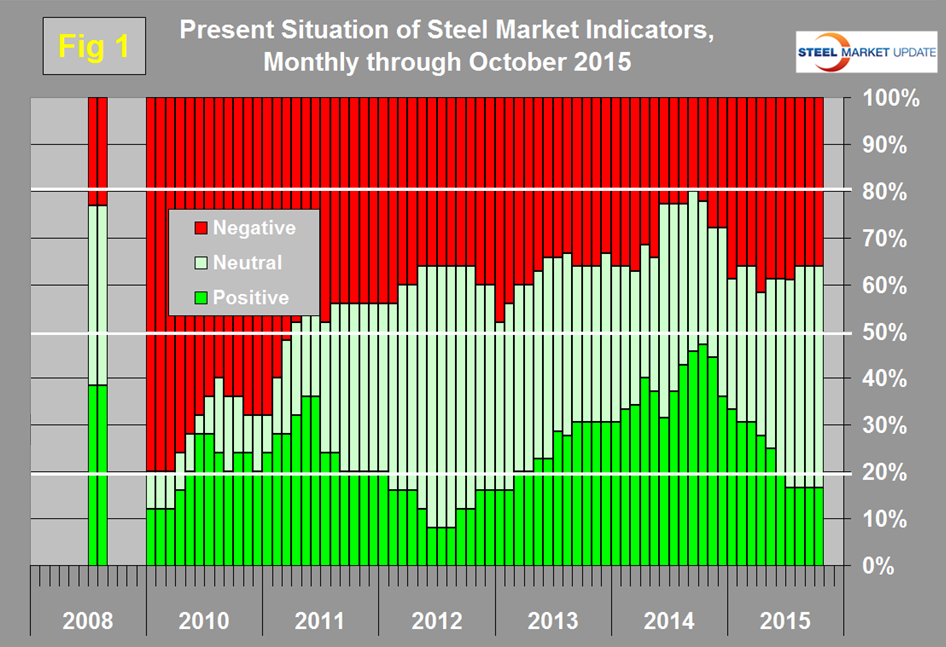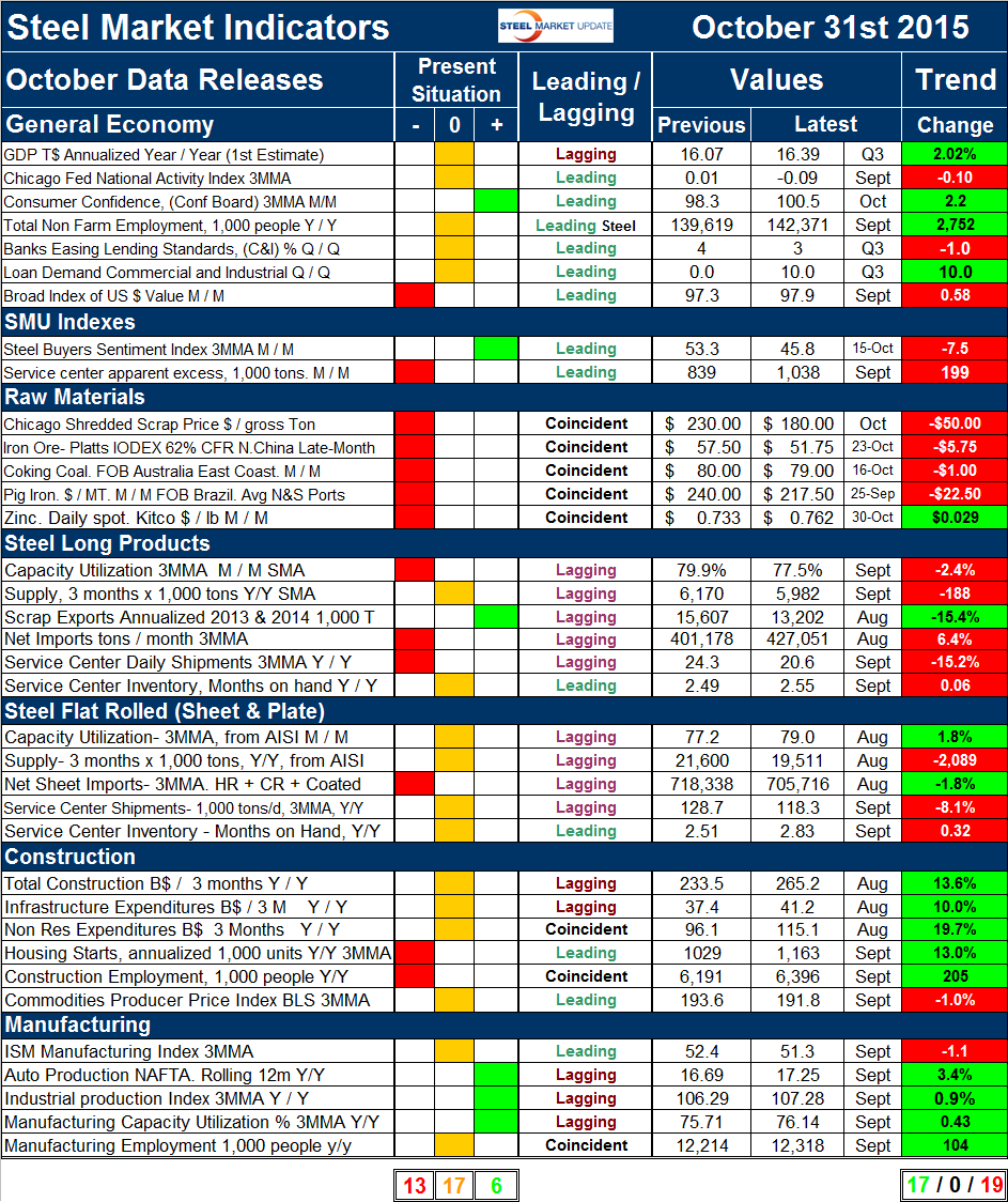 We have also re-created Table 1 for August 2008 before the steel crash of September that year to evaluate whether we should “have seen it coming.” Clearly at that time the present situation was fine and in fact better than it is today. The number of indicators classified as positive peaked at 17 in October last year and has steadily declined to the present value of 6. The first estimate of GDP growth in Q3 was released last week and on a trailing 12 month basis had a growth value of at 2.02 percent, well below the 3.0 percent threshold that we consider to be positive. We still regard the proprietary SMU steel buyer’s index as positive though the situation is deteriorating. All the raw materials prices currently have a negative present situation. The present situation of the long products market is marginally worse than for long products, particularly in terms of service center shipments. The capacity utilization of the long product mills was re-classified to negative from neutral, for the flat roll mills continued to be neutral. This is not an apples and apples comparison because the performance of the long product mills is based on SMA data and of the flat rolled mills on AISI data. There were no changes in our perception of the present situation of the indicators describing the construction industry. In the manufacturing sector the ISM manufacturing index fell below our positive threshold of 52 to reach 51.3 in the September data. A quick visual appraisal of the present situation shows that the general economy is basically neutral. Steelmaking raw materials are historically weak through October’s data. Both steel sectors are neutral to weak. Construction continues to be weak to neutral and manufacturing continues to be neutral to strong. No indicators are currently rated positive in the construction category. None of the manufacturing indicators on a present situation basis are currently negative.