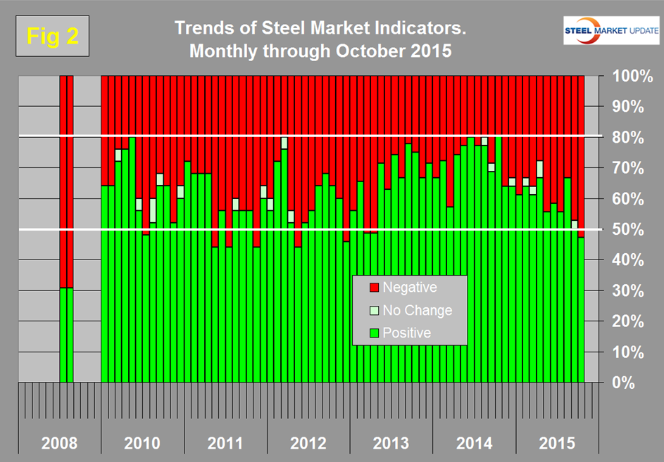 There were no changes to the direction of trends in the general economy. The trends of the two Steel Market Update proprietary indicators also maintained the same negative direction and in both cases the declining trend accelerated. The three month moving average of steel buyer sentiment declined to 45.8 on October 15th but as shown in Figure 3 is still at a historical high level.