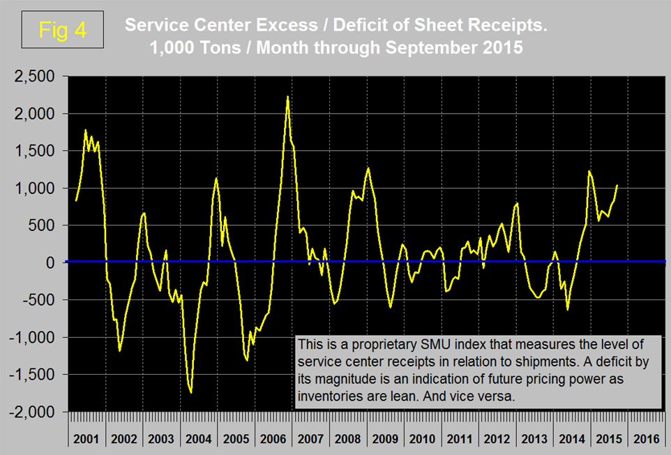 Service center excess which increased to 767,000 tons in August increased again to 1,038,000 tons in September. We regard this as indicative of weak pricing power going forward (Figure 4).