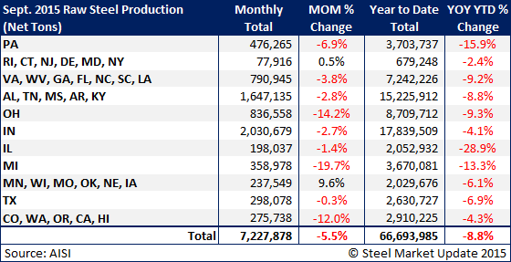 The American Iron & Steel Institute (AISI) recently reported final raw steel production estimates for the month of September 2015. The monthly estimates are different than the weekly estimates we report in our Tuesday issues; the AISI bases the monthly estimates on 75 percent of the domestic mills reporting vs. only 50 percent for the weekly estimates.