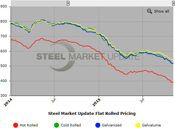 SMU Note: Below is a graphic showing our hot rolled, cold rolled, galvanized, and Galvalume price history. To use the graphs interactive capabilities, you must view it on our website here. If you need help navigating the website or need to know your login information, contact us at info@SteelMarketUpdate.com or by calling 800-432-3475.