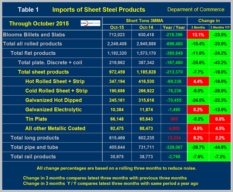 It compares the average monthly tonnage in the latest three months through October with both three months through July (3M/3M) and three months through October last year (Y/Y). Semi-finished slabs, blooms and billets were up by 13.1 percent 3M/3M but down by 23.5 percent Y/Y. The total tonnage of hot worked products was 2,249,408 tons in October on a 3MMA basis, down by 696,480 tons from October last year. The total hot worked tonnage was down by 10.4 percent 3M/3M and down by 23.6 percent Y/Y. These trends indicate that in the big picture the peak of import volume has passed but there are still some short term blips. The color codes in Table 1 for the three month and year over year change show which products are improving and which have still experienced import volume increases in these two time frames. It sometimes seems to us as we write these reports that we are contradicting ourselves but if readers use the tables for short term evaluation and the graphs for long term then our analysis should make sense.