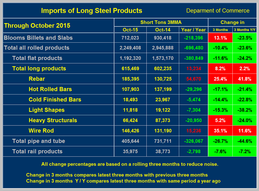 For total long products the tonnage was up by 13,234 tons Y/Y which was 2.2 percent. In 3M/3M the volume was up by 8.2 percent. Rebar and wire rod had substantial increases in both time comparisons and heavy structurals were up 3M/3M. Imports of pipe and tube declined by 26.7 percent 3M/3M and by 44.6 percent Y/Y. Rail products have been in a fairly narrow range since January last year.