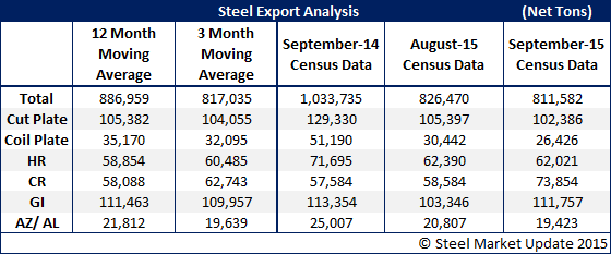 September steel exports totaled 811,582 net tons (736,256 metric tons), down 1.8 percent over August and down 21.5 percent from September 2014. Total September figures are below both the thee month moving average (3MMA, average of July 2015 through September 2015 figures) and the twelve month moving average (12MMA, average of October 2014 through September 2015 data).