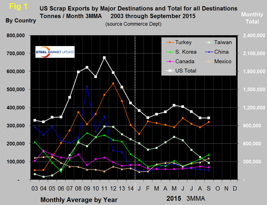 In the first nine months of this year bulk scrap exports were 9,968,048 tonnes for an annual rate of 13,290,731 tonnes, down by 13.8 percent from the first nine months of last year. The tonnages shown in Figure 1 are based on three month moving averages (3MMA) for 2015 and on the annual monthly average for previous years.