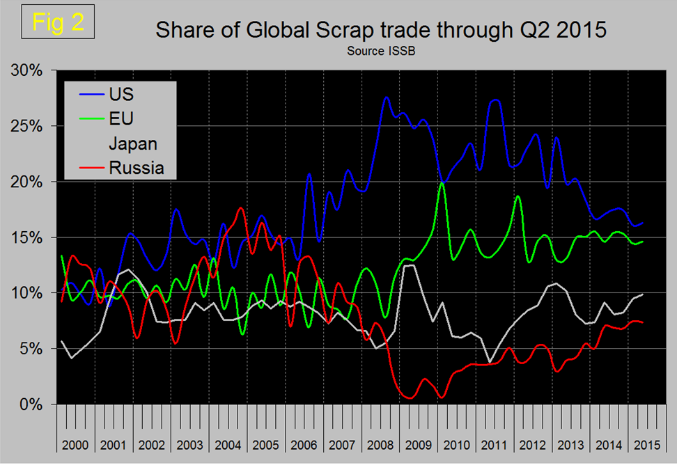 Global trade data for the third quarter won’t be available until the end of this month because many countries are slow in reporting. The US share of global scrap trade has steadily declined since 2011as the share of Russia and Japan has increased backed by their depreciated currencies. Russia has taken share from the US as a scrap source to Turkey.