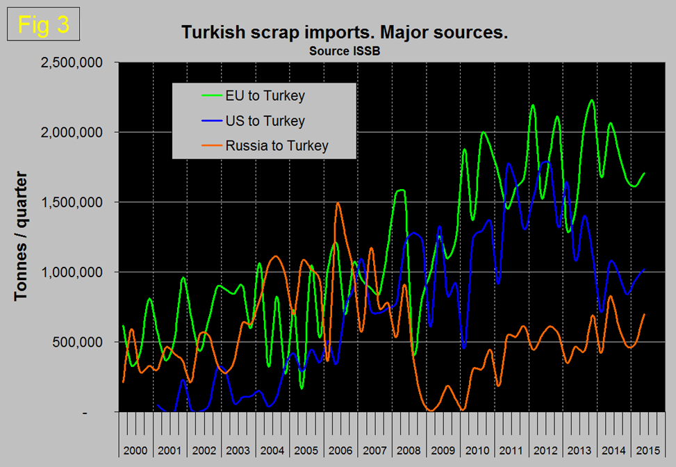 The graph shows that exports declined for three consecutive years, 2012 through 2014 continuing through January and February this year. March saw a trend reversal that continued through May followed by three months of decline. The September tonnage was almost exactly the same as August on a 3MMA basis. In the twelve months of 2014, scrap exports totaled 15,308,000 tonnes, down by 17.1 percent from the same period in 2013.