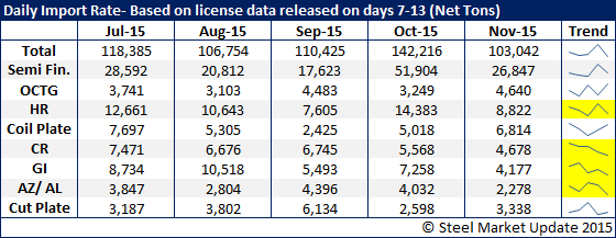 We are seeing a downward trend in cold rolled which has been slowing over the past few months. Galvanized (which just had preliminary determination and critical circumstances announcements) is also seeing license requests slowing. When looking at hot rolled, license requests have tapered off so far this month after surging last month. It is too early to call the lower numbers as the beginning of a longer term trend but, that is the expectation as CVD and AD announcements (along with critical circumstances) are coming for HR over the next couple of months.