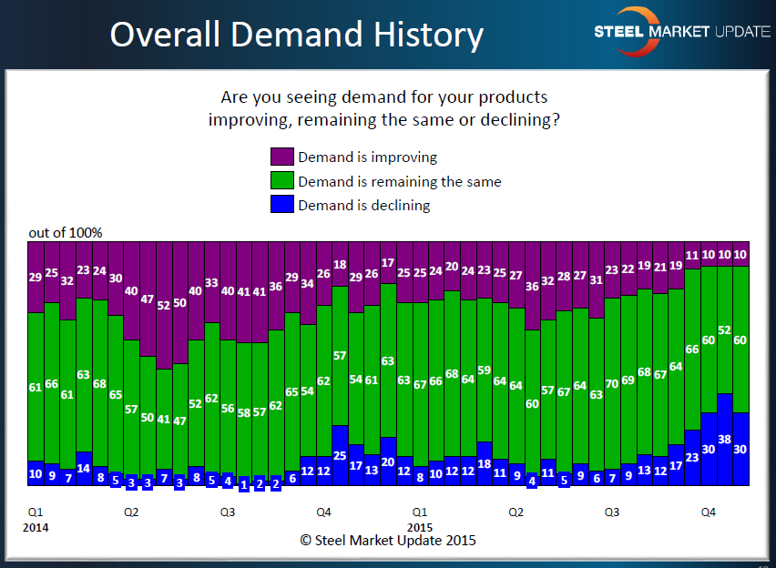 As you can see by the graphic below, since mid third quarter our respondents as a group have been indicating a change in the demand trend, with approximately one third of the respondents reporting demand as declining vs. 10 percent reporting demand as improving.