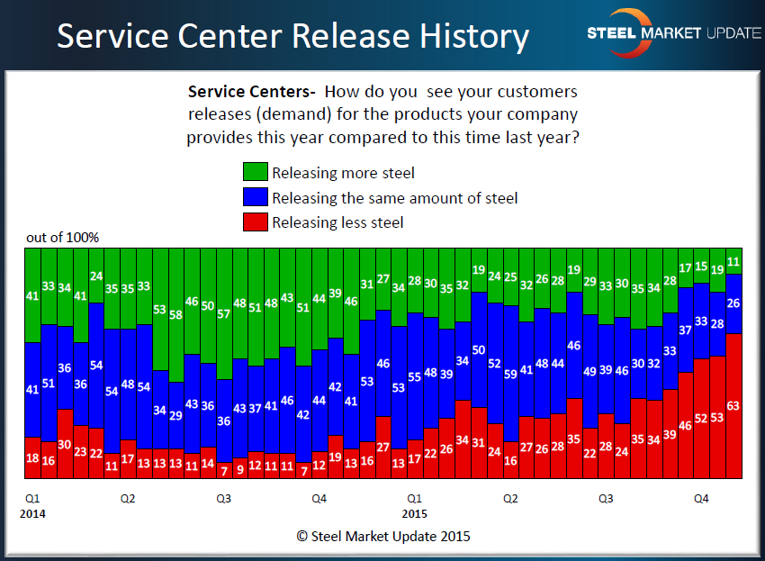 From the service center perspective you can see an even more dramatic view of the negative trend, expanding from the high 20’s at the beginning of the third quarter to last week’s 63 percent reporting their customers as releasing less steel.