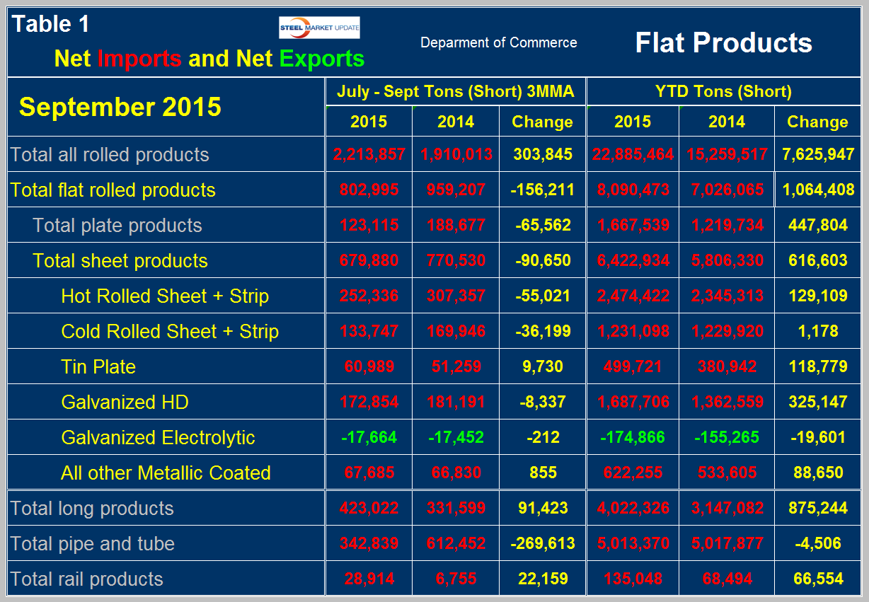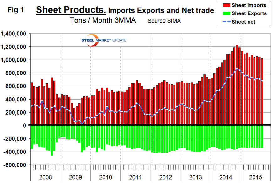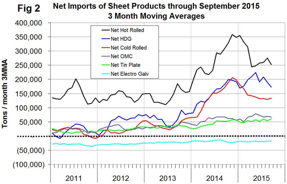Figure 1 shows that net sheet product imports on a three month moving average (3MMA) basis at 679,880 tons in September continue to be more than double that which existed before the recession but have been declining all this year.