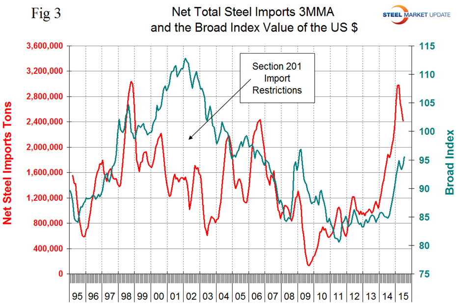 We believe there are two main drivers of the strength of net steel imports. The trade weighted value of the US $ is increasing which makes our exports less attractive to foreign buyers. It makes the US domestic market more attractive to foreign sellers because they reap more in their own currencies and it makes imports more attractive to domestic buyers. Figure 3 shows the relationship between net imports and the value of the $ since January 2011.