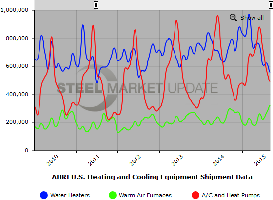 Below is a graph showing the history of water heater, warm air furnace, and air conditioner shipments. You will need to view the graph on our website to use it’s interactive features, you can do so by clicking here. If you need assistance with either logging in or navigating the website, please contact our office at 800-432-3475 or info@SteelMarketUpdate.com.
