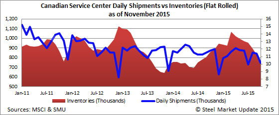 Canadian shipments for all steel products in the month of October were 422,400 net tons, a decrease of 6.5 percent from the month before and decrease of 18.3 percent from October 2014. Inventories at the end of the month stood at 1,355,300 tons, down 7.3 percent from last month and down 12.3 percent from the same month one year ago. The daily average receipt rate for October was 15,033 tons per day (21 day month), down from 17,281 tons per day the month before (21 day month). Total October receipts were 47,200 tons lower than the September figure. According to the MSCI, total months on hand stood at 3.4 months on a seasonally adjust basis or 3.2 months unadjusted.