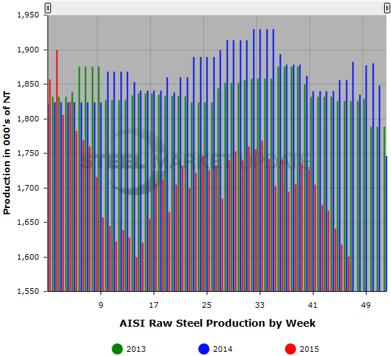 For the week ending November 14, 2015, the American Iron & Steel Institute (AISI) estimated the U.S. steel industry produced 1,601,000 net tons of raw steel, a 1.1 percent decrease over the previous week and a 13.7 percent decrease over the same week one year ago. The estimated capacity utilization rate is 67.0 percent, down from 67.7 percent last week and down from 77.2 percent this time last year.