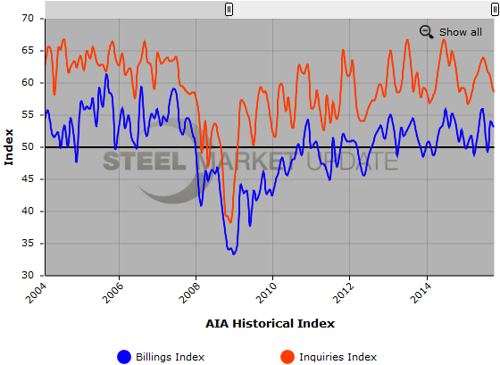 Below is a graph showing the history of the AIA Architecture Billings Index and Inquiries Index. You will need to view the graph on our website to use it’s interactive features, you can do so by clicking here. If you need assistance with either logging in or navigating the website, please contact our office at 800-432-3475 or info@SteelMarketUpdate.com.