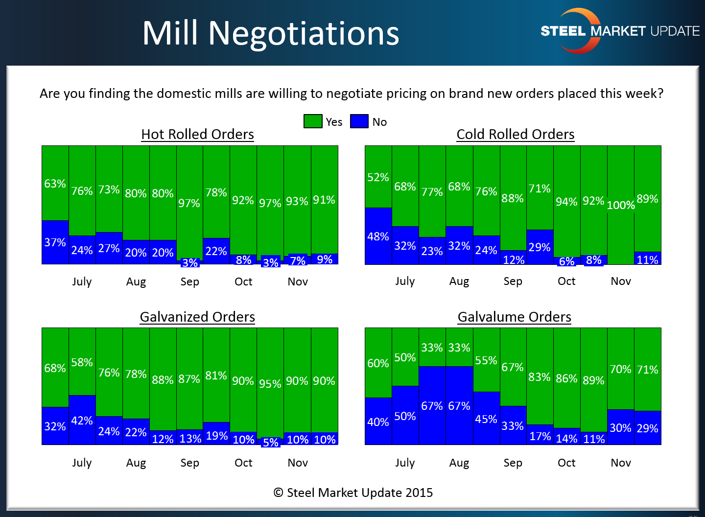 Seventy-one percent of our respondents reported the domestic mills as willing to negotiate Galvalume prices. This is unchanged from two weeks ago but is well below the high 80’s that we were collecting during September through the middle of October.