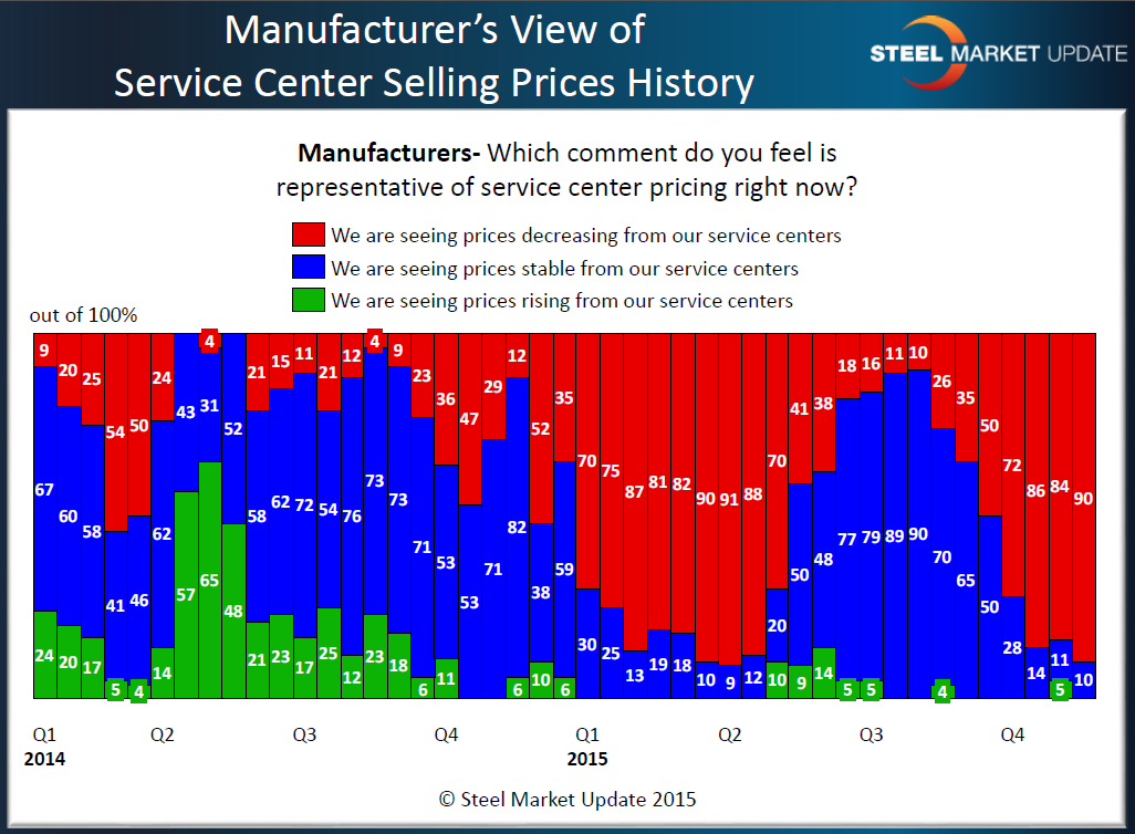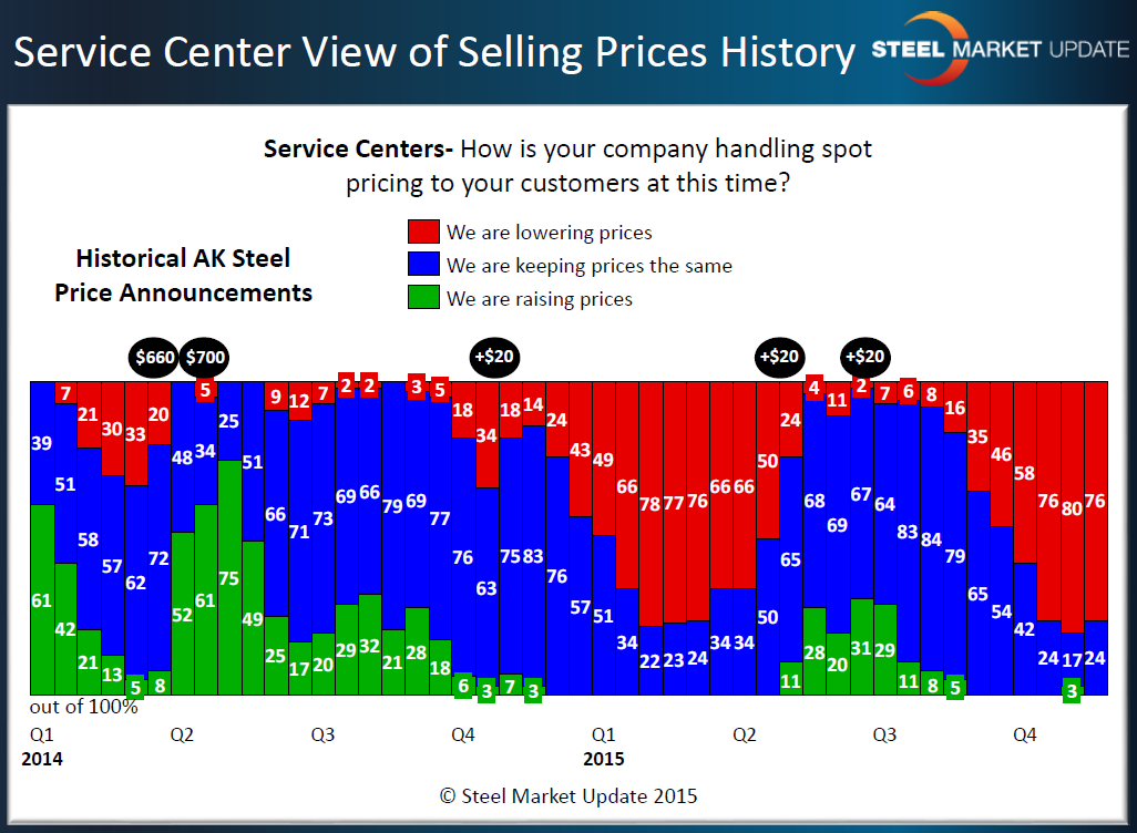 The last time manufacturers reported decreasing service centers pricing at a saturation level goes back to early 2nd Quarter. The trend toward lower spot pricing was stopped once the domestic steel mills announced price increases in late April/early May 2015. This can be seen in the graphic below (Service center view of spot pricing) where we have overlaid the AK Steel price increase announcements (since they are public and can be tracked on the AK Steel website) onto the service center responses regarding spot pricing.