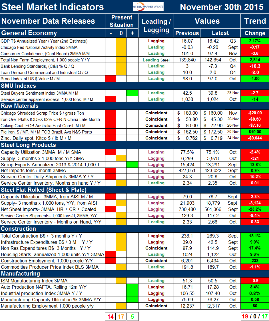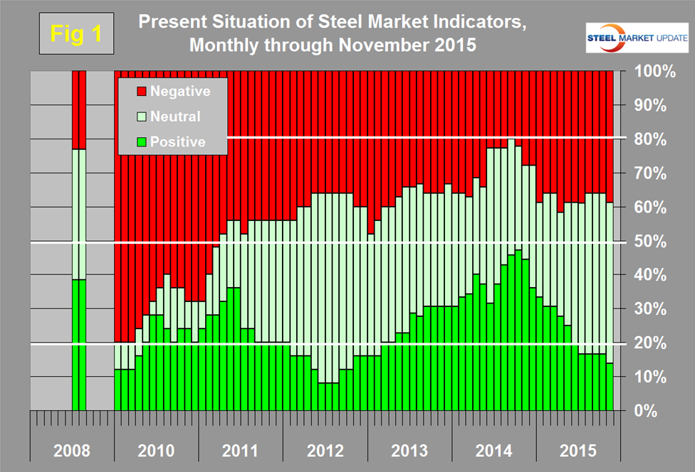 The number of indicators classified as positive peaked at 17 in October last year and has steadily declined to the present value of 5 which is 13.9 percent. There has not been much change in the number of indicators that we consider to be historically negative in the course of 2015, what has happened is that the decline in the positive indicators has occurred as a shift to neutral. We still regard the proprietary SMU steel buyer’s index as positive though the situation is deteriorating. All the raw materials prices currently have a negative present situation. The present situation of the long products market is marginally worse than for flat rolled, the decider is service center shipments which are historically low for longs but in the normal range for flat rolled. The capacity utilization of both the long product and flat rolled mills is now negative, this is based on shipments, not on crude steel production which is the basis of AISI and WSA calculations. In our analysis here, comparing capacity utilization and supply of the two steel sectors is not apples and apples because the performance of the long product mills is based on SMA data and of the flat rolled mills on AISI data. There were no changes in our perception of the present situation of the construction or manufacturing industries. A quick visual appraisal of the present situation shows that the general economy is basically neutral. Steelmaking raw materials are historically weak through November’s data. Both steel sectors are neutral to weak. Construction continues to be weak to neutral and manufacturing continues to be neutral to strong. No indicators are currently rated positive in the construction category. None of the manufacturing indicators on a present situation basis are currently negative.