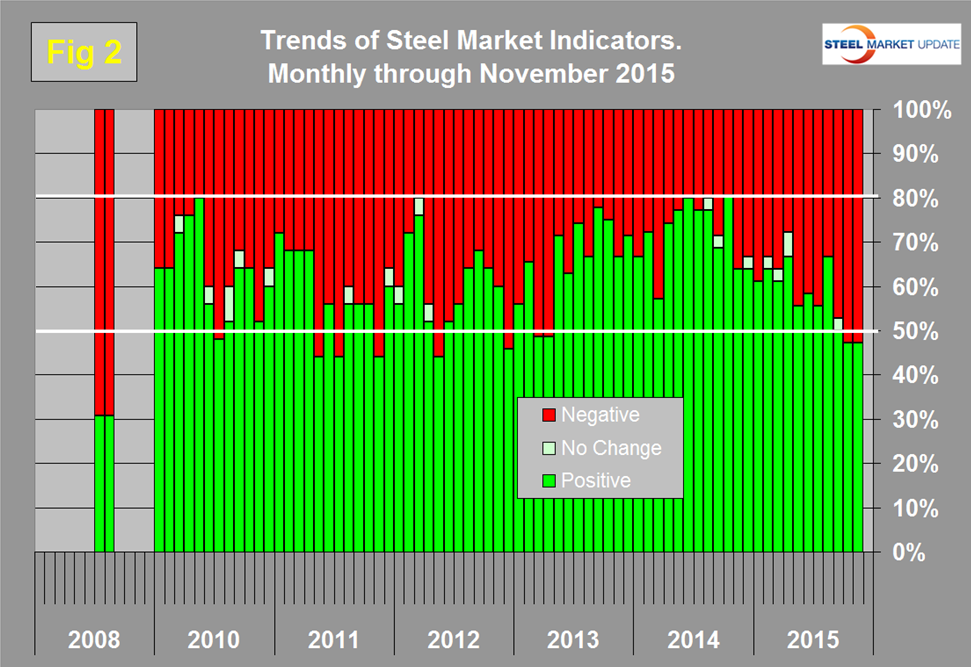 There was an increase of one negative and a decrease of one positive indicator in our overall evaluation of the present situation. We currently regard 5 of the 36 indicators to be positive, 17 to be neutral and 14 to be negative on a historical basis. Changes in the last month were as follows; consumer confidence fell below 100 in November and we re-classified it from positive to neutral. The capacity utilization of flat rolled products fell below 78 percent and we re-classified it from neutral to negative. We now have 5.5 years of this analysis and have graphed the changes in the present situation and trends over time. Figure 1 shows the change in our assessment of the present situation since January 2010 on a percentage basis.