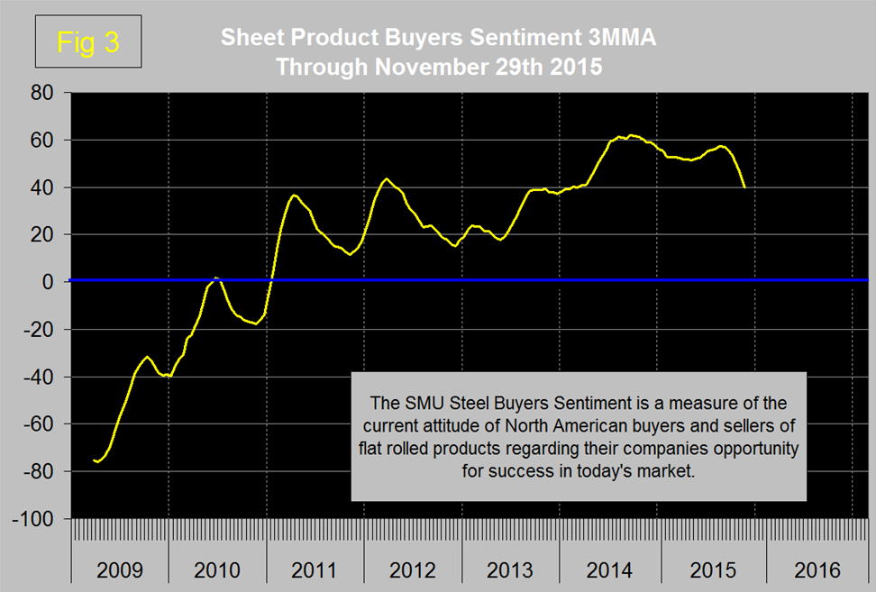 There were three changes to the direction of trends in the general economy. Consumer confidence reversed course as mentioned above. Demand for commercial and industrial bank loans became less positive though still expanding and the broad index value of the US $ took a breather and contracted for the first time since June. We regard a weakening dollar as positive because of its effect on net imports. The trend of the Steel Market Update buyer’s sentiment index continued to be negative with a three month moving average of 39.8 on November 29th but as shown in Figure 3 is still at a historical high level.