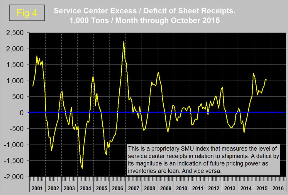 There was a slight improvement in the service center excess inventory of sheet products. Service center excess which increased to 767,000 tons in August increased again to 1,038,000 tons in September then declined to 1,024,000 tons in October. We regard this inventory level as a leading indicator of weak pricing power (Figure 4).