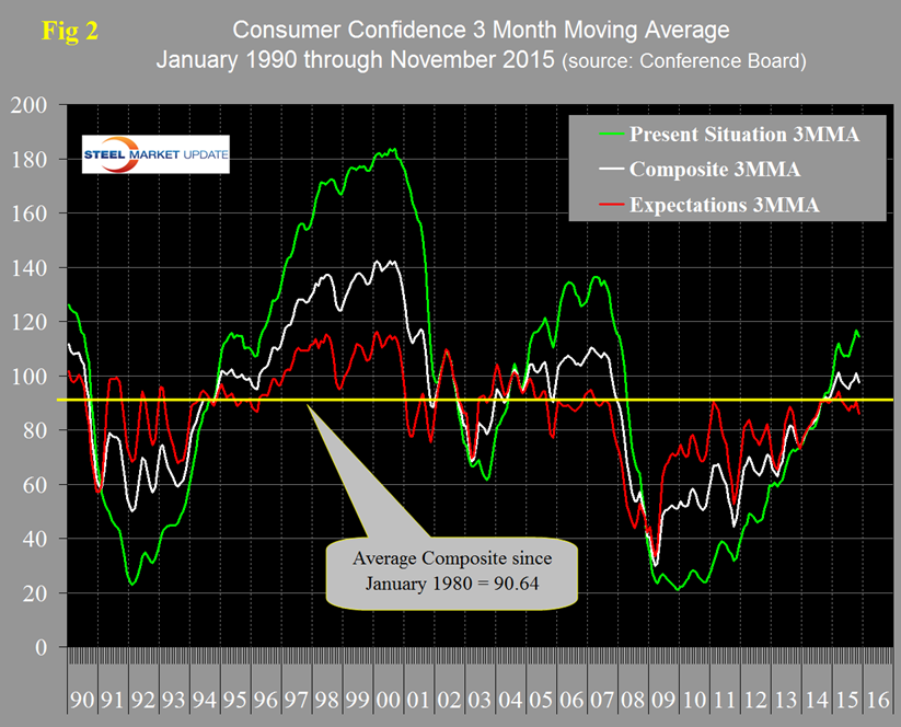 As we have reported in earlier write-ups on this subject, 2015 has been tremendously more variable month to month this year than last. In all of 2014 the monthly change ranged from +5.1 to -4.4, this year the range has been +10.7 to -8.8 points. In November the composite declined by 8.7 points to 90.4 but the three month moving average (3MMA) decreased by only 3.6 to 97.4 points. In the first 11 months of 2015 there have been 2 months, March and October when the 3MMA of the composite was 101 points. In the other 9 months the total spread was from 95.1 to 98.6 points. The 3MMA of the present situation continues to be above its five year trend and that of expectations has now fallen below its 5 year trend (Figure 1).