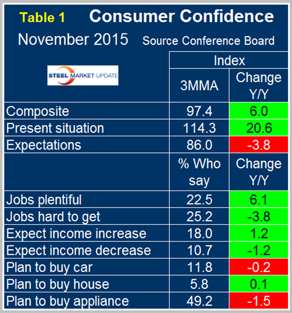 “Consumer confidence retreated in November, following a moderate decrease in October,” said Lynn Franco, Director of Economic Indicators at The Conference Board. “The decline was mainly due to a less favorable view of the job market. Consumers’ appraisal of current business conditions, on the other hand, was mixed. Fewer consumers said conditions had improved, while the proportion saying conditions had deteriorated also declined. Heading into 2016, consumers are cautious about the labor market and expect little change in business conditions.”
