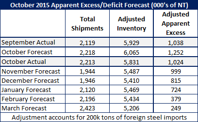 Based on our Apparent Excess/Deficit model we have October as having 1,024,000 tons in excess of what our model considers “balanced” inventories for this time of year and business conditions. Our original forecast was for the excess to grow to 1,252,000 tons.