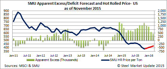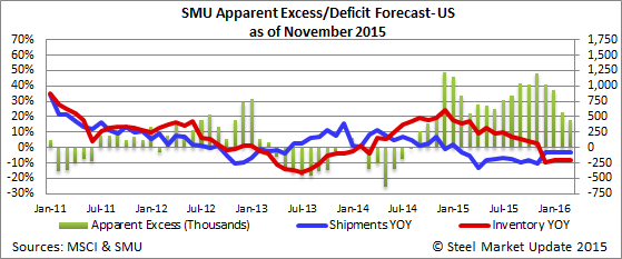 As part of your Premium level service, Steel Market Update (SMU) analyzes the service center shipment and inventory data and provides a short term forecast for carbon flat rolled steel shipments, inventories and how they will impact pricing over the next four months. This is done through a proprietary model and the results provided are called the Service Center Apparent Excess/Deficit forecast.