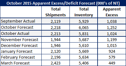 Our Apparent Excess will rise due to the industry being at the end of the year (when shipments tend to slow over the Holidays). However, our forecast calls for the Apparent Excess to shrink in January, February and March.