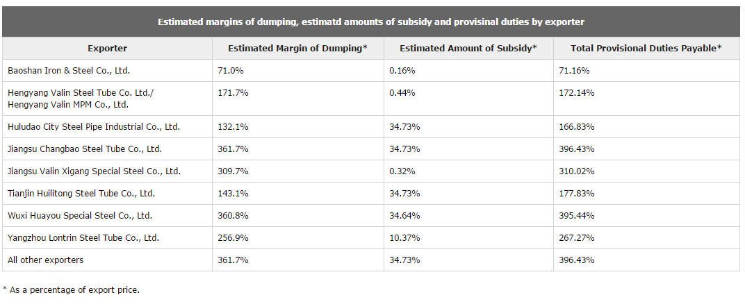 Canada Border Services Agency released its preliminary determination on dumping and subsidization of steel line pipe exported from China and assigned provisional duties ranging from 71 percent to 396 percent. CBSA estimates that in 2014, 48.8 percent of carbon and alloy steel pipe imports to Canada were from China. That share increased to 55.9 percent from July 2014 to June 2015.