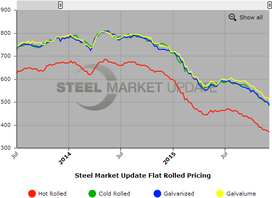 SMU Note: Below is a graphic showing our hot rolled, cold rolled, galvanized, and Galvalume price history. To use the graphs interactive capabilities, you must view it on our website here. If you need help navigating the website or need to know your login information, contact us at info@SteelMarketUpdate.com or by calling 800-432-3475.