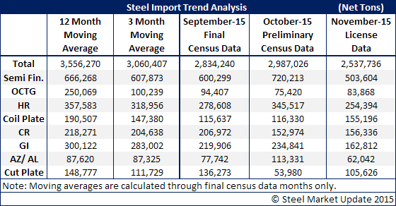 The U.S. Department of Commerce released license data collected through December 1st for the month of November. Based on license data (which can vary from the final census numbers) November foreign steel imports should be approximately 2.5 million net tons. If correct, this would be the lowest level seen since December 2013 which was the last time imports were 2.5 million tons.