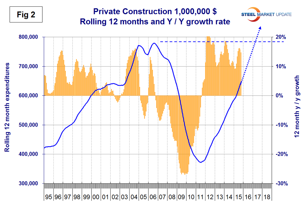 Educational buildings are by far the largest sub sector of S&L non-residential at $5.635 billion in October. Recreational buildings have accelerated markedly in the first 9 months of 2015 and grew by 12.4 percent in the latest data. This includes convention centers, sports arenas, theaters and miscellaneous amusements. Table 2 shows that S&L health care expenditures contracted by 11.5 percent but $503 million is much less than the $2.821 billion of private healthcare expenditures which grew at 11.2 percent. August was the first months for public safety buildings which includes jails, police, courthouses and fire stations to have positive growth after 32 straight months of contraction. September and October reverted to contraction for this sector. Comparing Figures two and three it can be seen that S&L construction did not have as severe a decline as private work during the recession and that at first private work bounced back faster. S&L expenditure growth has now recovered to the point that at the present rates both sectors will exceed the pre-recessionary peaks within 18 months.