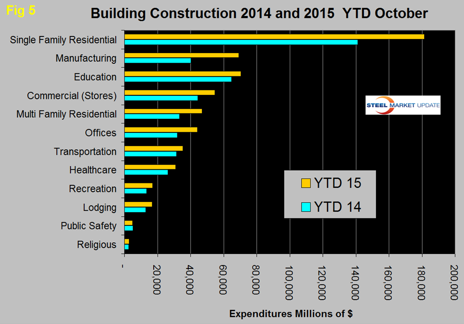 Figure 5 compares YTD expenditures for building construction for 2014 and 2015.