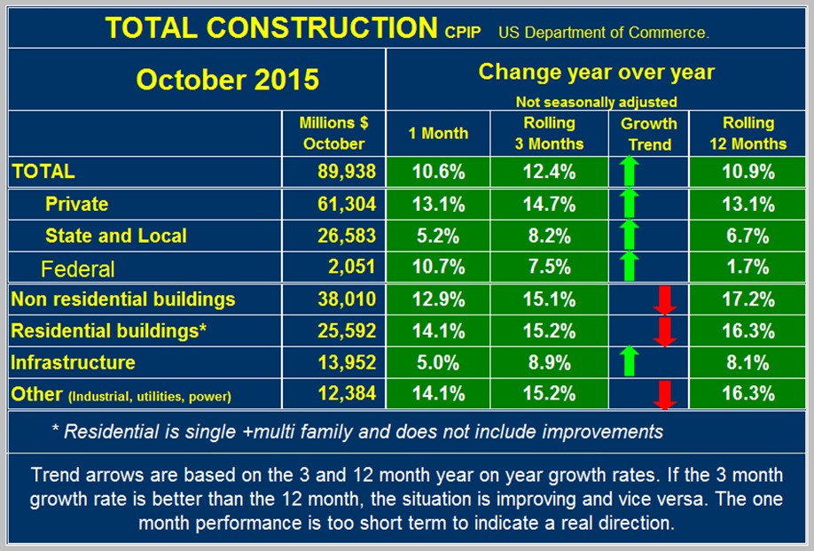 On a rolling three month basis y/y total construction was up by 12.4 percent led by private work up by 14.7 percent. Total construction growth is accelerating since the short term growth (3 months 12.4 percent) is higher than the long term (10.9 percent). We report this as positive momentum. Note this is not a seasonal effect because our y/y analysis removes seasonality. All three categories, private, S&L and federal had positive momentum in the October report. On a rolling 12 month basis Federal construction declined every month for 43 months with September’s report being the first to reverse that trend with a positive 1.3 percent growth rate followed by October at +1.7 percent. We consider four sectors within total construction. These are non-residential, residential, infrastructure and other which is industrial, utilities and power. The growth rate of non-residential buildings is a very high at 15.1 percent but its growth rate has flattened. Residential is growing at 15.2 percent with negative momentum. Infrastructure grew 8.9 percent in three months through October year over year with positive momentum and other grew by 15.2 percent with negative momentum. The growth rate of total construction slowed in the first three months of this year but improved in the period April through October as shown by the brown bars in Figure 1. The pre-recession peak of total construction on a rolling 12 month basis was $1,145 B in 12 months through February 2007. The low point was $665.1 B in 12 months through October 2011. The 12 month total through the latest data of October 2015 was $939 B. July through October were the first months to exceed $900 B since April 2009 when the recession was gaining traction.