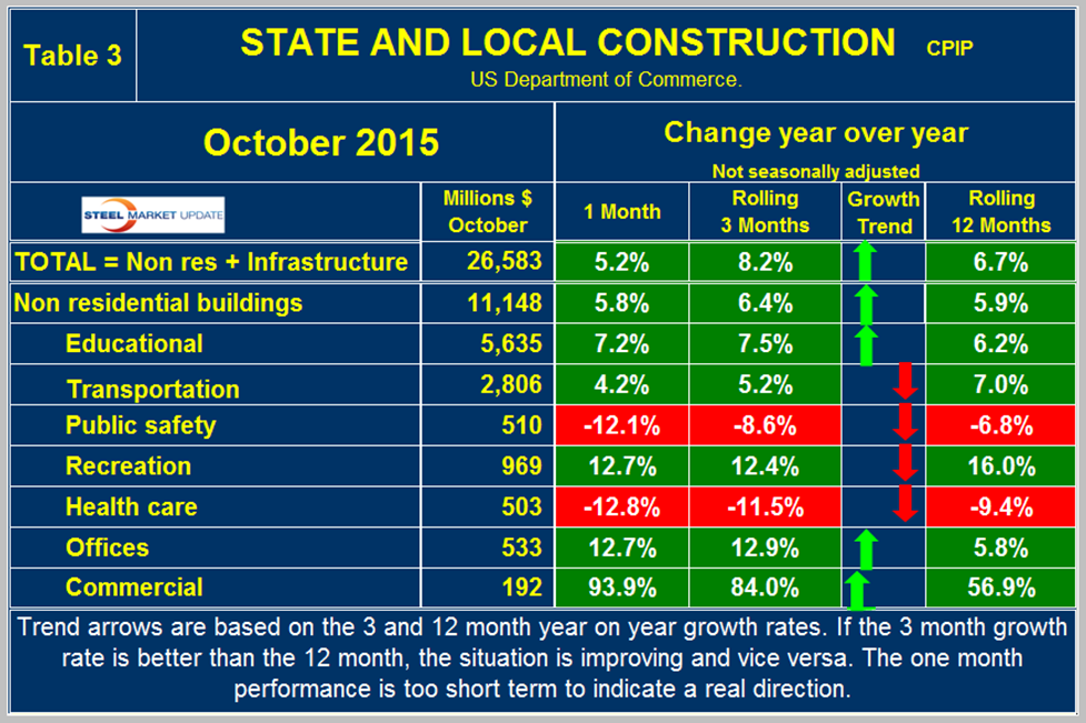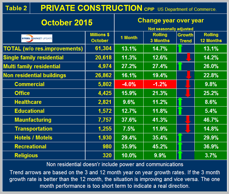 Explanation: The official CPIP press report gives no appreciation of trends on a historical basis and merely compares the current month with the previous one on a seasonally adjusted basis. The detail is hidden in the published tables which we at SMU track and dissect to provide a long term perspective. Our intent is to provide a rout map for those subscribers who are dependent on this industry to “Follow the money.” This is a very broad and complex subject therefore to make this monthly write up more comprehensible we are keeping the information format as consistent as possible. In our opinion the absolute value of the dollar expenditures presented are of little interest. What we are after is the magnitude of growth or contraction of the various sectors. Data is reported by the Commerce Department on both a seasonally adjusted and non-adjusted basis. Their official commentary is based on adjusted numbers. In the SMU analysis we consider only the non-seasonally adjusted data because we don’t trust seasonal adjustments and in any case our businesses operate in a seasonal world. We eliminate seasonal effects by comparing rolling three month expenditures year over year. CPIP data also includes the category of residential improvements which we have removed from our analysis in the rational that such expenditures are minor consumers of steel.