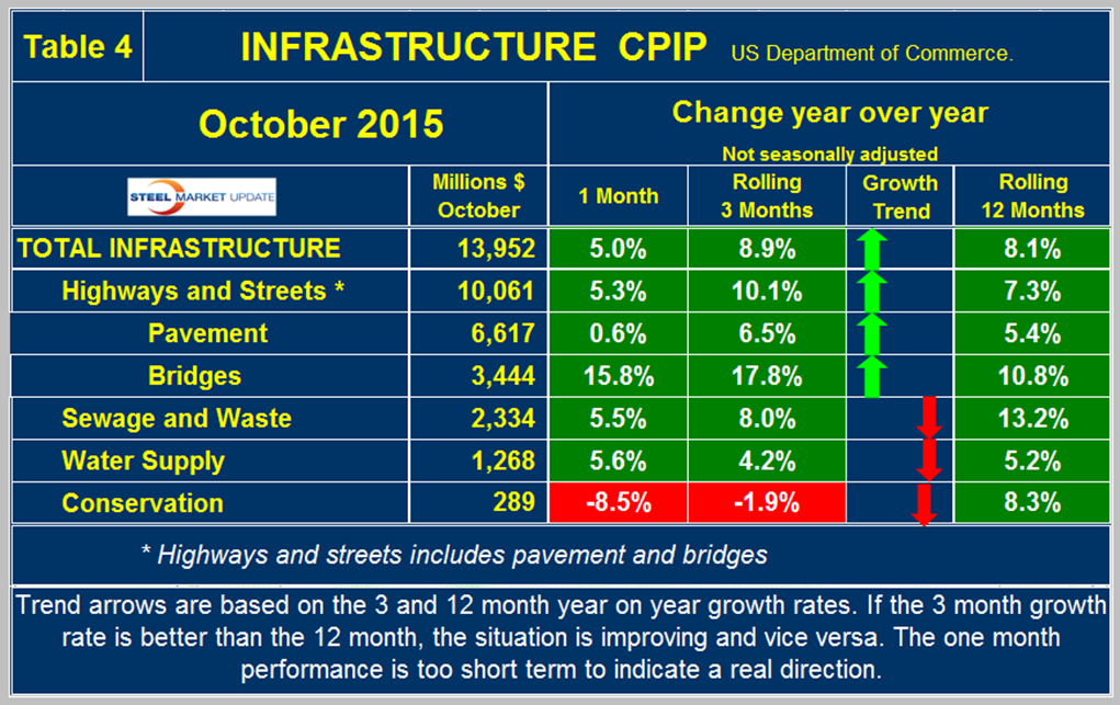 Expenditures have had positive growth in each of the last 27 months through October with a +8.9 percent result in the latest data with positive momentum. Highway and streets including pavement and bridges accounts for about 2/3 of total infrastructure expenditures and had positive growth for 15 months through February, contracted in March and April then grew by double digits in the last three months through October. Highway pavement is the main subcomponent of highways and streets and had a 6.5 percent positive growth in three months through October. Bridge work contracted every month in the period August through November 2014 but has since expanded every month with an accelerating trend. Bridge work totaled $3.4 billion in the single month of October with a strong 17.8 percent growth rate (Table 4).