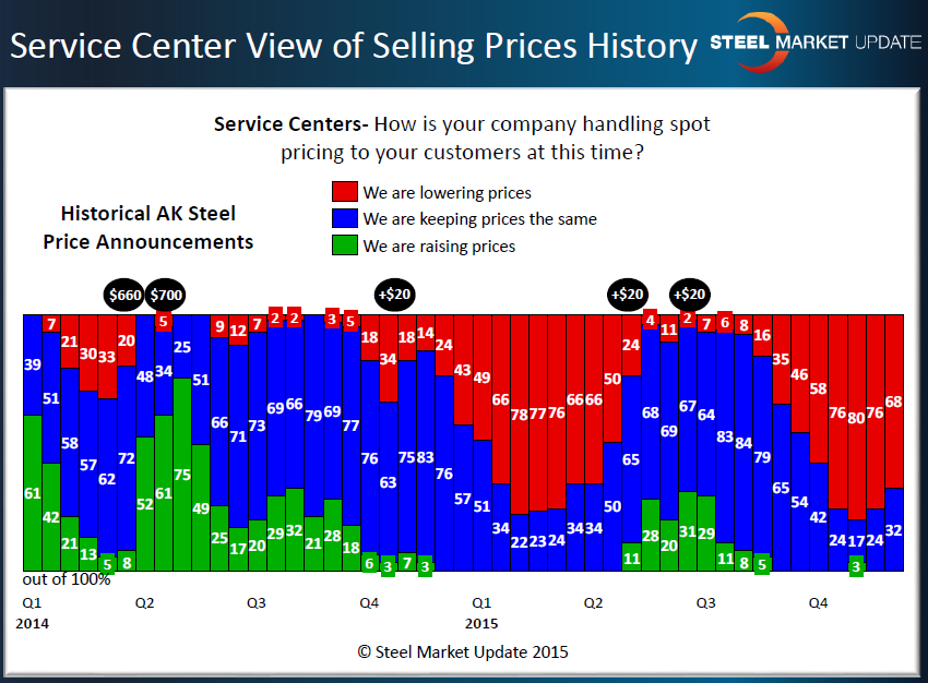 At the same time, 68 percent of the service centers reported that their company was lowering spot pricing to their end user customers. This is down slightly from the 76 percent reported two weeks ago as well as the 75 and 80 percent calculated over the course of the previous survey.
