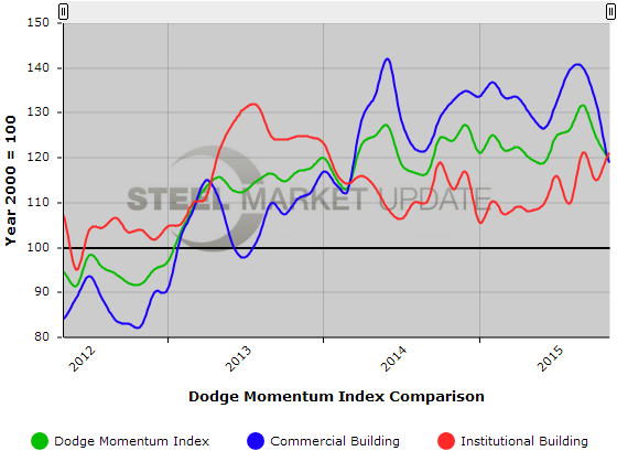 Below is a graph showing the history of the Dodge Momentum Index. You will need to view the graph on our website to use it’s interactive features, you can do so by clicking here. If you need assistance with either logging in or navigating the website, please contact our office at 800-432-3475 or info@SteelMarketUpdate.com.