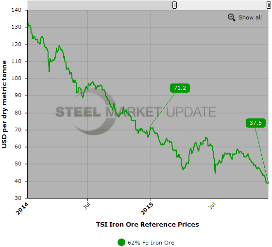 As the domestic mills announce price increases in the hopes of changing market momentum, one of the negatives is the spot price of iron ore in China (the largest seaborne ore buyer). Iron ore prices have been collapsing for the past two years with 62% Fe fines reaching $37.5/dmt today (TSI data).