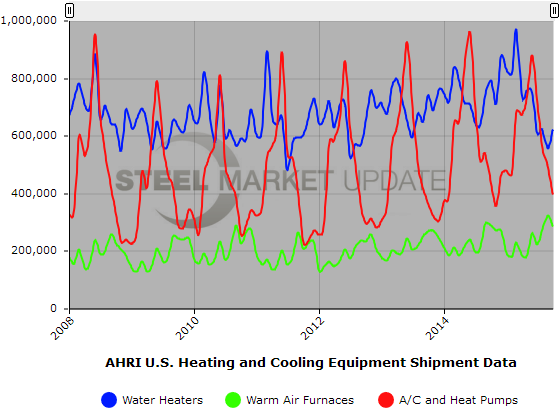Below is a graph showing the history of water heater, warm air furnace, and air conditioner shipments. You will need to view the graph on our website to use it’s interactive features, you can do so by clicking here. If you need assistance with either logging in or navigating the website, please contact our office at 800-432-3475 or info@SteelMarketUpdate.com.