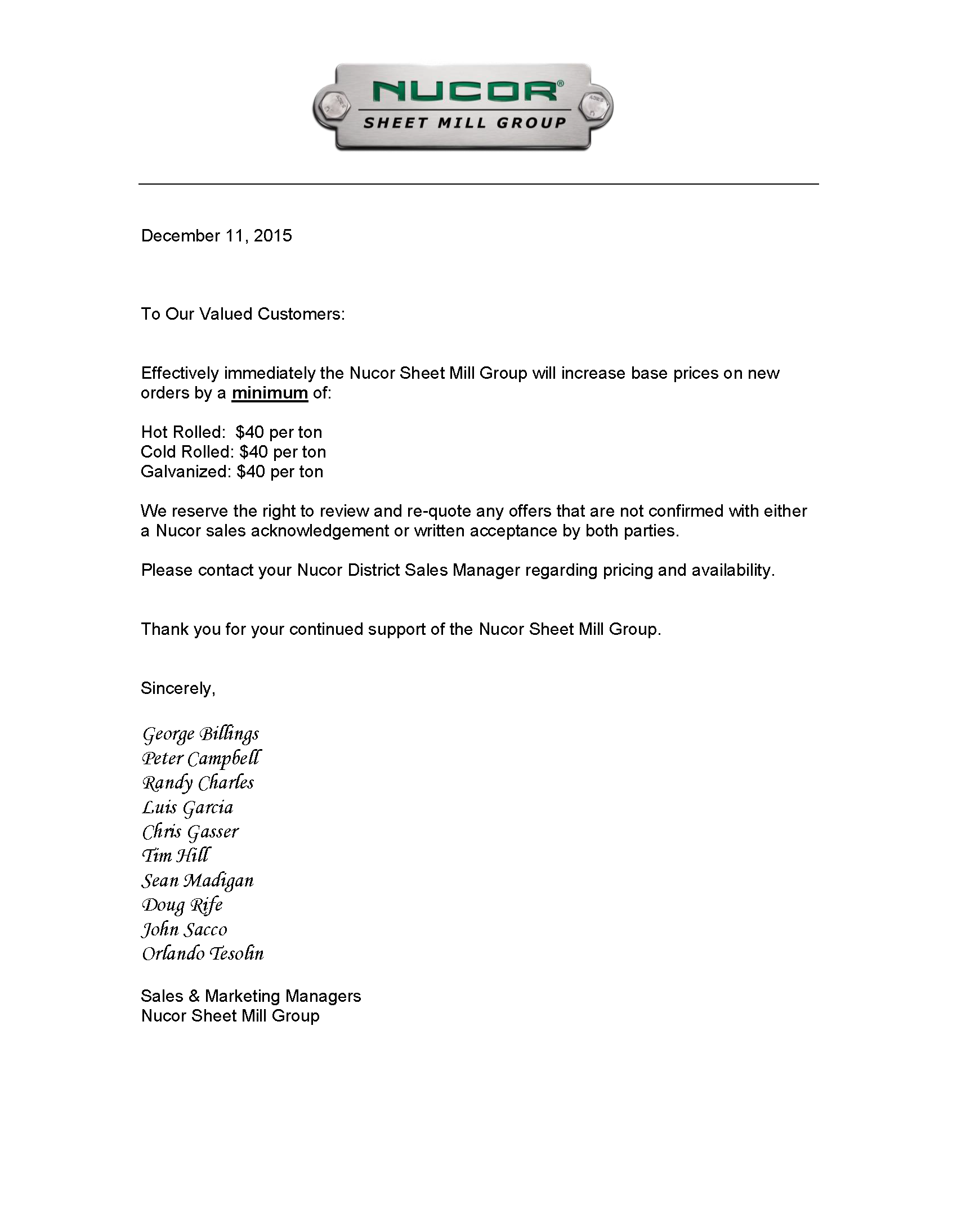 Nucor sent a letter to their customers advising them that base prices on new orders would increase by a minimum of $40 per ton ($2.00/cwt). Products affected were hot rolled, cold rolled and galvanized steels.