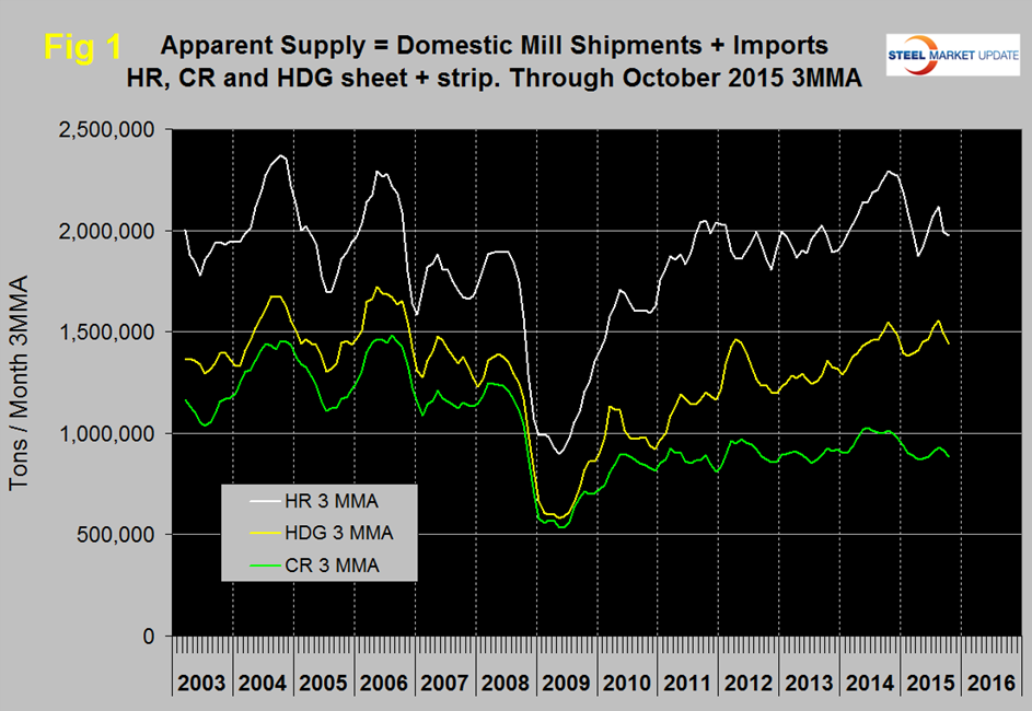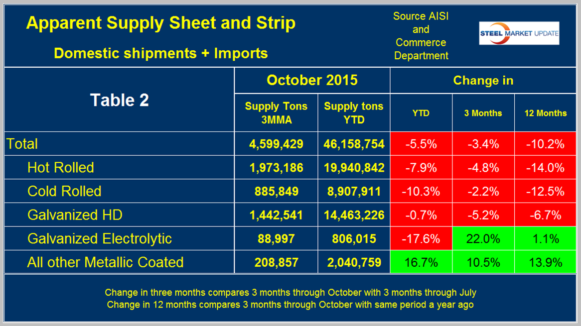 Apparent Supply is a proxy for market demand and is defined as domestic mill shipments to domestic locations plus imports. In three months through October 2015 the average monthly supply of sheet and strip was 4,599,000 tons, down by 10.2 percent year over year as mentioned above. In the last three months supply was down by 3.4 percent compared to May through July and down by 10.2 percent year over year. The short term decline is less than the long term which means that the decline is slowing. Table 2 shows the change in supply by product on this basis through October.