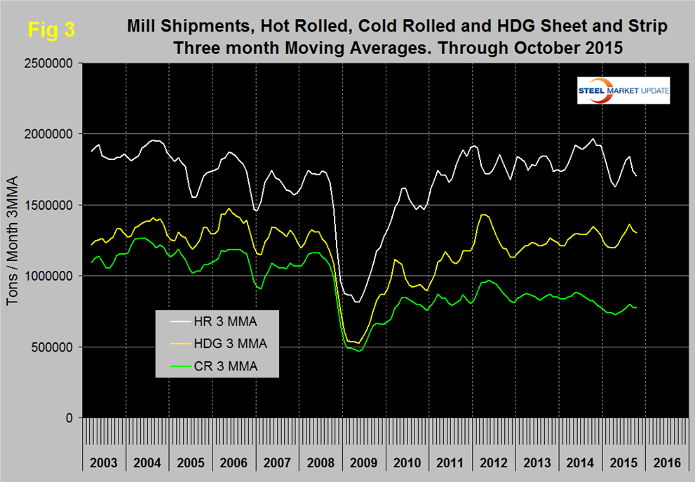 Mill Shipments. Table 3 shows that total shipments of sheet and strip products including hot rolled, cold rolled and all coated products were down by 5.7 percent in 3 months through October year over year but up by 2.1 percent comparing three months through October with three months through July.