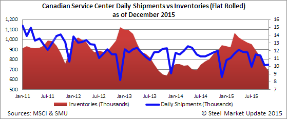 Canadian shipments for all steel products in the month of November were 399,000 net tons, a decrease of 5.5 percent from the month before and decrease of 11.3 percent from November 2014. Inventories at the end of the month stood at 1,286,400 tons, down 5.1 percent from last month and down 19.1 percent from the same month one year ago. The daily average receipt rate for November was 16,505 tons per day (20 day month), up from 15,033 tons per day the month before (21 day month). Total November receipts were 14,400 tons higher than the October figure. According to the MSCI, total steel product inventories stood at 3.2 months at the end of November, unchanged from October.